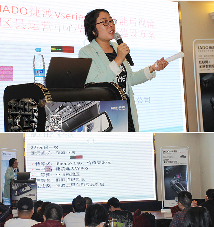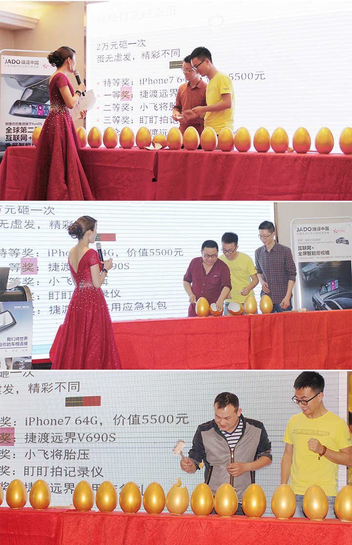 會上,主辦方盛東方為大家準備了精彩爆場的砸金蛋活動,并由客戶按照下單順序依次砸蛋,其中特等獎為iPhone7,一共5個,iPhone7雖未上市,但是盛東方彭總有言在先,只要砸中特等獎的客戶絕對是iPhone7發售之后的第一批用戶。同時,還有遠界系列V690S、小飛將胎壓、盯盯拍、捷渡遠界車用大禮包等產品等大家砸蛋開獎。